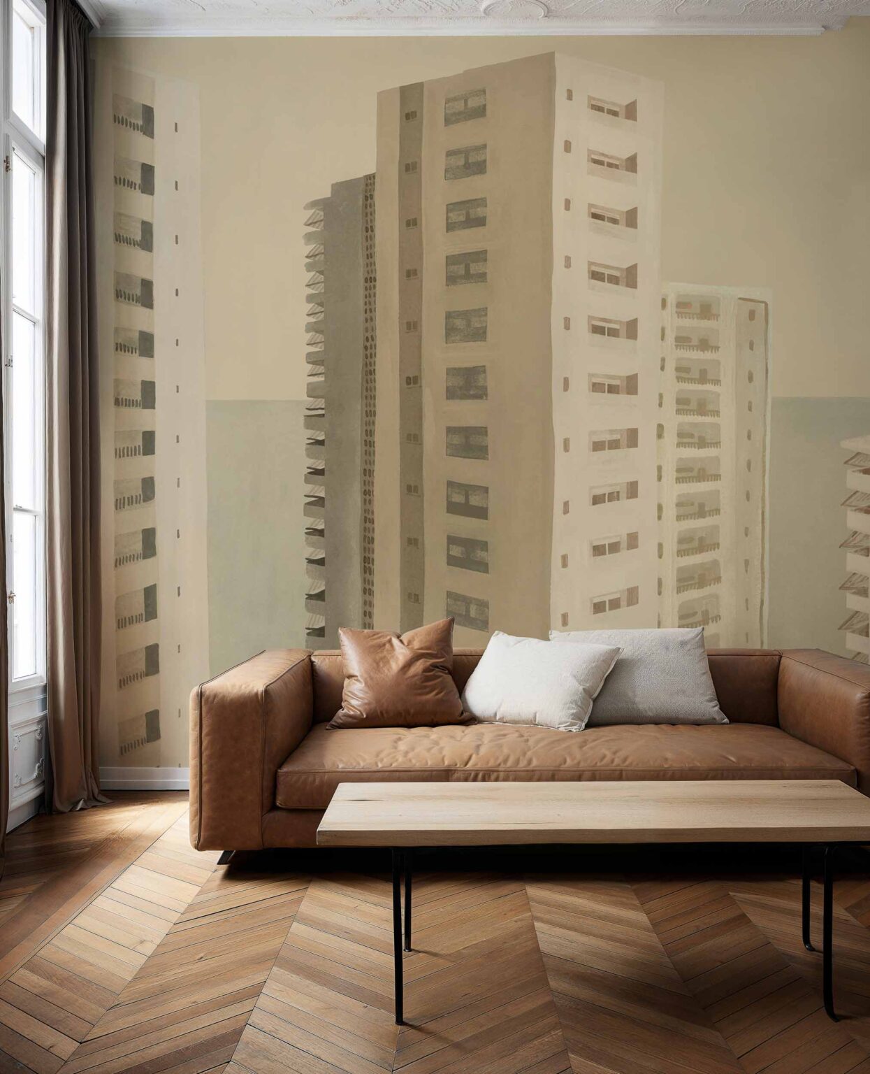 Tres Tintas’s Benidorm Beige is a Landscapes design in Beige/Nude from the Solera collection. A forest of infinite skyscrapers that defy gravity by capturing the reflections of the Mediterranean on their facades. A game of mirrors where the sky appears to multiply in the windows of the buildings, creating magical kaleidoscopes that caress the coast.