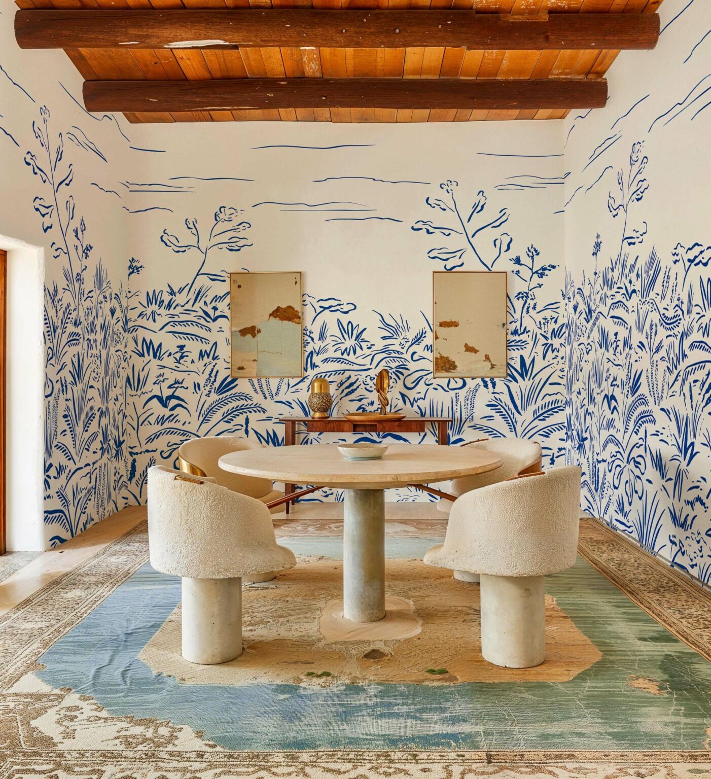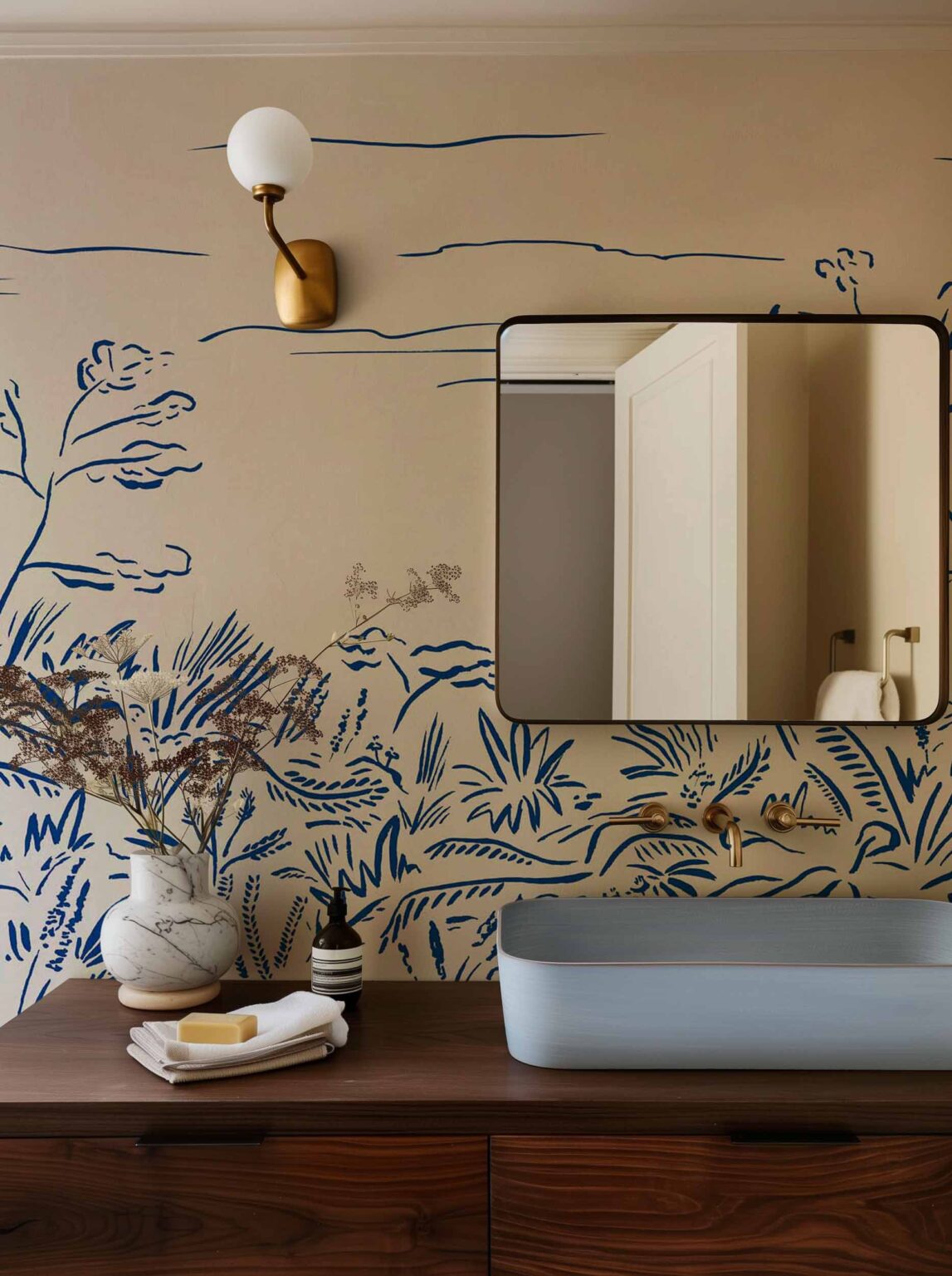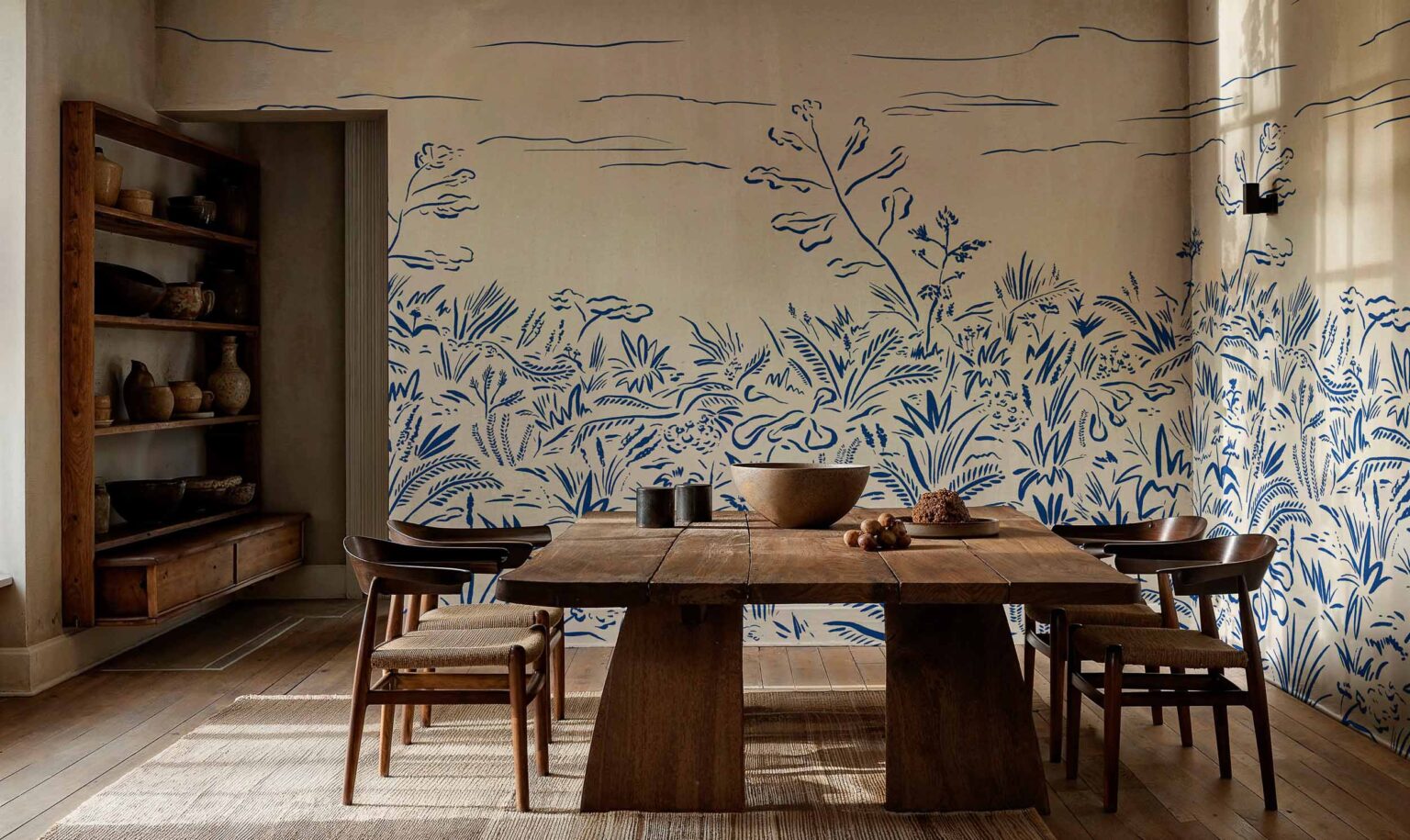 Coordonne’s Floral Cave Blue is a landscape inspired wallpaper in Blue/Navy tones from the New Primitivism collection. The simplicty of a vegetable landscape drawn by hand.