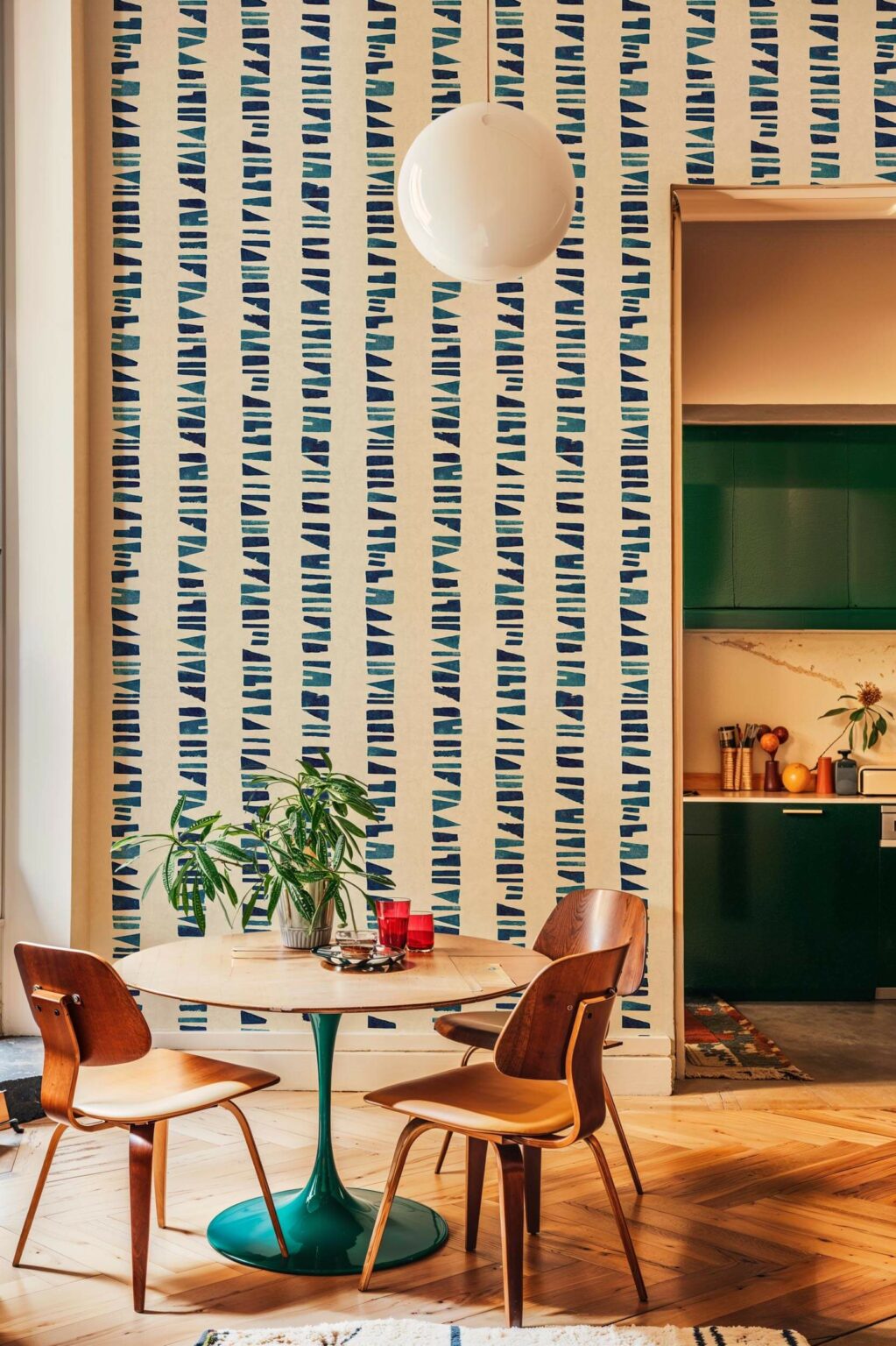 Coordonne’s Linear Footprints Blue is a stripe inspired wallpaper in Blue/Navy tones from the New Primitivism collection. Tribal print with wood blocks.
