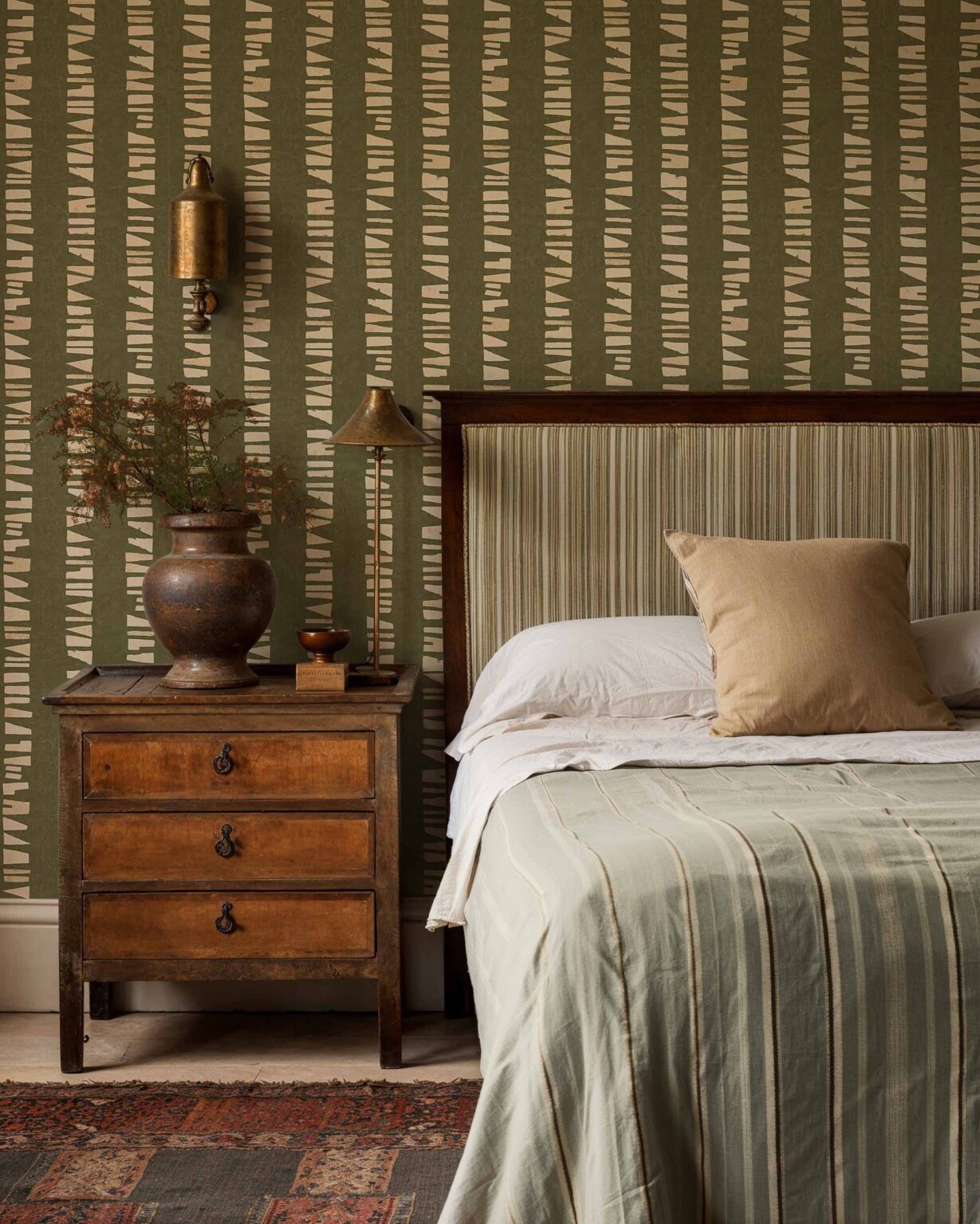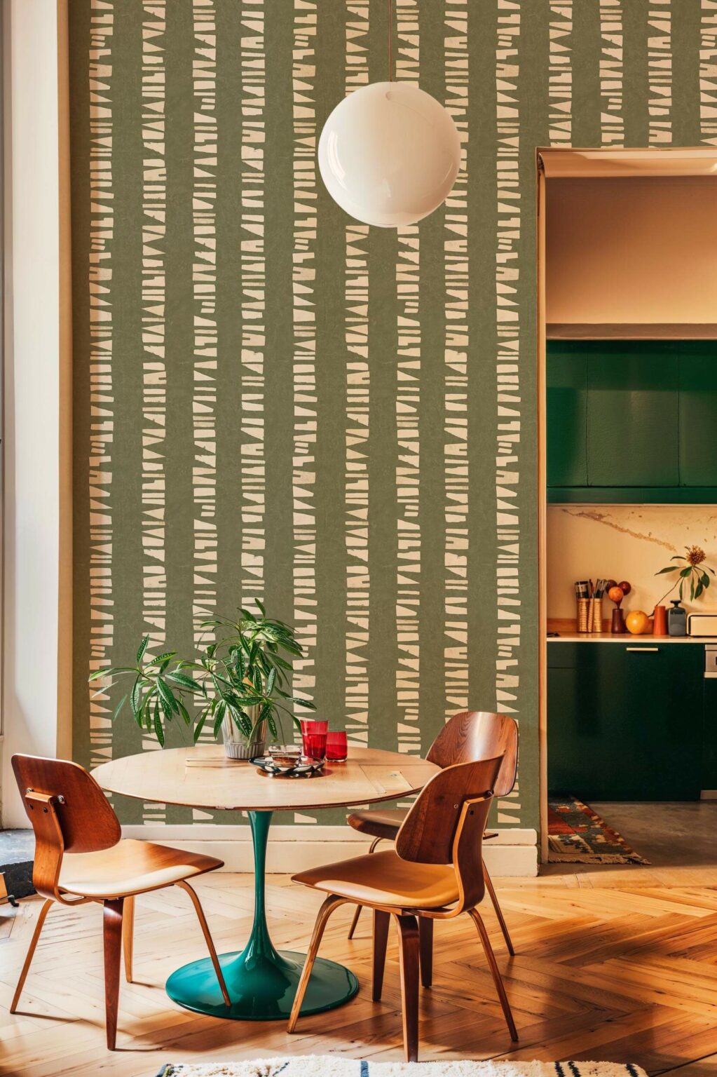 Coordonne’s Linear Footprints Green is a stripe inspired wallpaper in Green tones from the New Primitivism collection. Tribal print with wood blocks.